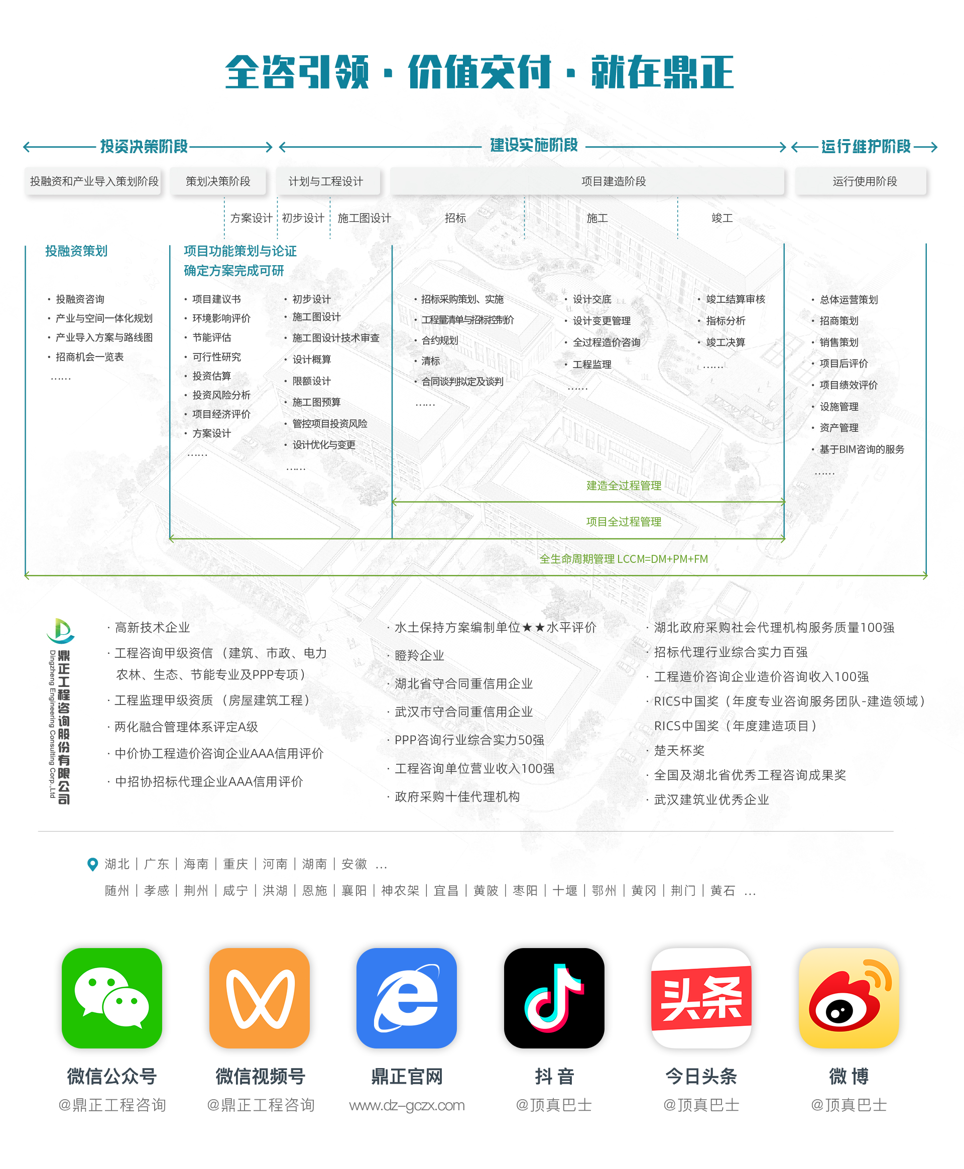 鼎正深入貫徹落實國家戰(zhàn)略部署,積極響應新時代發(fā)展要求,深化建設新型高端智庫,堅定不移為推動國家經(jīng)濟社會高質(zhì)量發(fā)展貢獻鼎正智慧。聚焦業(yè)務延鏈,鼎正成功探索并實踐了從“全過程工程咨詢”向“全域咨詢”轉(zhuǎn)型的創(chuàng)新發(fā)展路徑。全域咨詢服務模式通過全域全過程全方位咨詢以實現(xiàn)區(qū)域效益最大化,其服務涵蓋了全域戰(zhàn)略空間規(guī)劃、系統(tǒng)性項目策劃、多元化資金申報與籌措、綠色低碳發(fā)展以及項目全過程工程咨詢等,通過整合多方資源,服務邊界能夠延伸至縱向到底、橫向到邊。在這一模式的推動下,我們成功實現(xiàn)了從單一項目服務向區(qū)域整體增值的跨越,為客戶提供的不僅僅是單純的咨詢服務,更是一種全方位的價值創(chuàng)造。