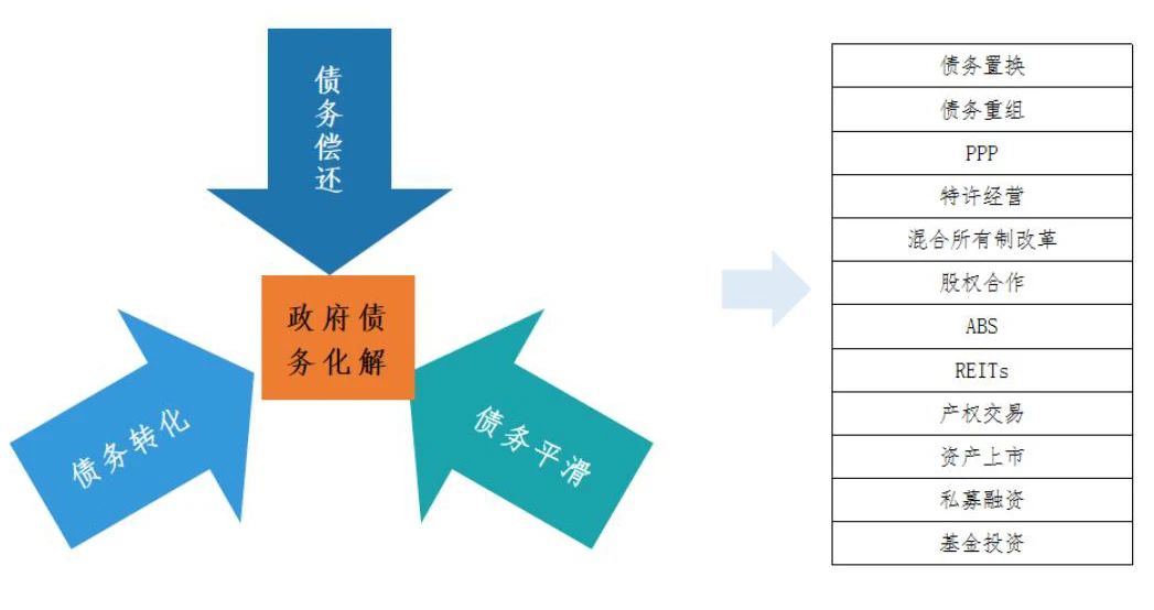 結(jié)合國(guó)家相關(guān)政策、學(xué)術(shù)理論以及實(shí)踐經(jīng)驗(yàn),我們提出了圍繞“債務(wù)平滑、債務(wù)轉(zhuǎn)化、債務(wù)償還”三大策略方向,主要運(yùn)用“債務(wù)置換、債務(wù)重組、PPP、特許經(jīng)營(yíng)、混合所有制改革、股權(quán)合作、ABS、REITs、產(chǎn)權(quán)交易、資產(chǎn)上市、私募融資、基金投資”十二種工具,建立明確的債務(wù)化解規(guī)劃,制定分年度債務(wù)化解目標(biāo),切實(shí)有效實(shí)現(xiàn)政府隱性債的化解,促進(jìn)地方政府投融資運(yùn)作健康可持續(xù)。